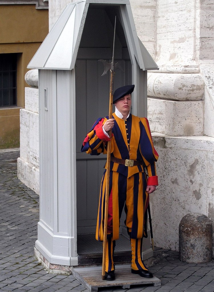 Don’t be fooled by the sumptuous Renaissance costume. Tourists may liken these guards to medieval court jesters but the Pontifical Swiss Guard, established in 1506, is among the oldest military units in continuous operation. It is considered an elite force and is highly selective in its recruitment.