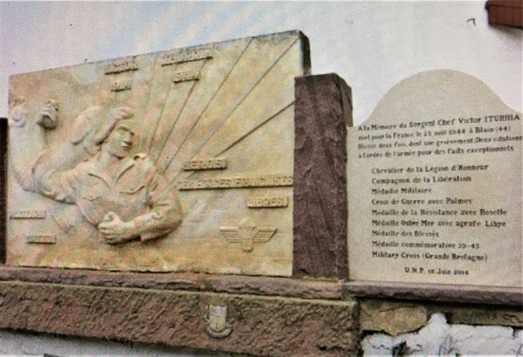 Not far from here is a memorial to Victor Iturria who was evacuated to England during the battle of Dunkirk where he joined the Free French Forces. In 1944 he parachuted into occupied France and fought with the French resistance and was killed in an ambush. This memorial shows him throwing a grenade adding…. exécutant le même movement comme un joueur de pelote basque.