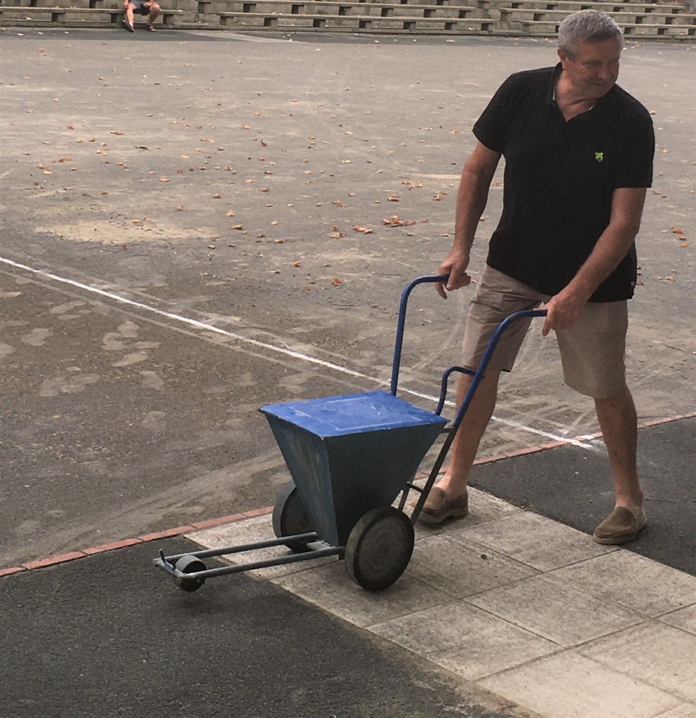 We tend to sit on the highest concrete level trusting that it is safer up there. There is chain link fencing but it’s not to protect spectators from random balls but put there to stop people falling back and rolling down the slope to the car park. It was one of those calm, sultry evenings and the ball was being hit higher up than usual, so high that its flight was obscured by the line of tree on the opposite side. The next we knew was the ball hitting the iron stanchion next to Madame‘s head with a resounding crack then ricocheting off the post on to her shoulder. The game came to a standstill. Hundreds of pairs of eyes swivelled in our direction, the anxious players gathered round and Gerard came to assess the damage. A few centimetres to the left and Gerard might have been looking at a potential customer. Fortunately the iron post had taken the sting out of the trajectory but had still left an ugly bruise.