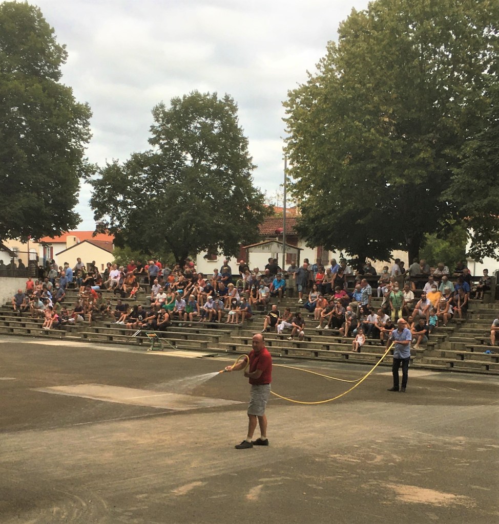 Madame and I went to town for the final. While the linesman always has to touch up the boundaries we have never seen the court watered. Still, it was the final and we have had a drought for two months. We were warned to wear masks – a warning that most people ignored. History repeated itself. A high ball came dropping swiftly in our directions – but was fortunately caught by me! Years of youthful cricket practice paid dividends. During the game four gendarmes appeared. Masks miraculously appeared. They watched the game for a while then went away. Maybe it was too much hassle to interrupt a final. Result: Baïgorry 40 Navarrenx 29.